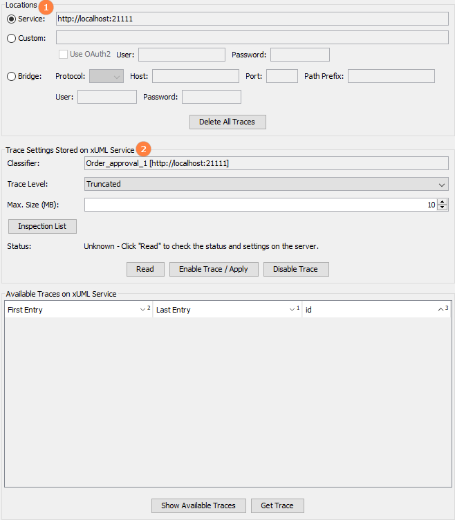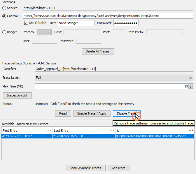 Once you have configured the service location and the trace settings as required, you can activate the tracing by clicking Enable Trace / Apply.