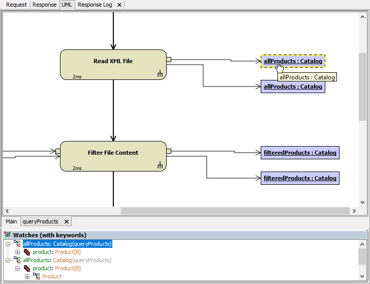 The menu displays a list of all input parameters. In the example above it is only one: request. Select a parameter from the list to add it to the Watches window at the bottom of the UML tab. For more information on the Watches window, refer to Watching Object Values further below.