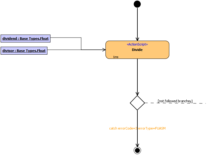 If an error has been caught in the model, the test case is green. Nevertheless, the caught error branch is displayed in the UML view in orange color: