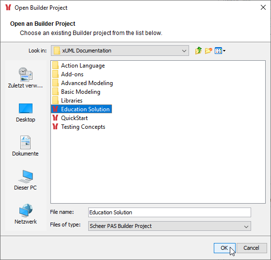 Also, the Builder comes with many examples. If you have chosen the default settings while unpacking the examples, you will find many projects in folder C:\xUML Documentation, e.g. project Education Solution which you can use to try out the Analyzer. For more information on how to unpack the examples, refer to Unzipping the Builder Examples.