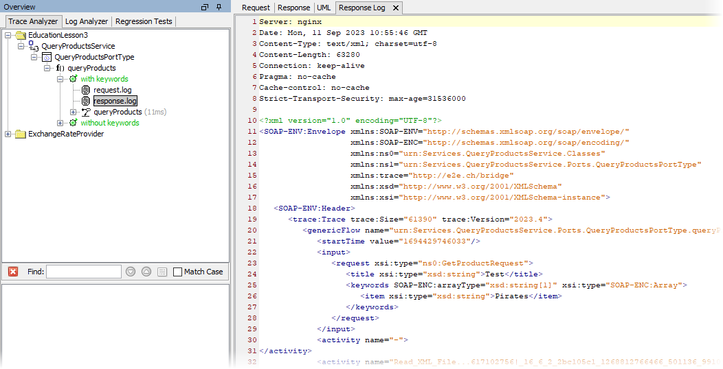 If you select the node response.log in the Trace Analyzer pane, the transcript of the response SOAP message that has been sent from the service is displayed in a separate tab.