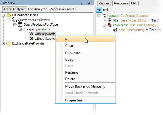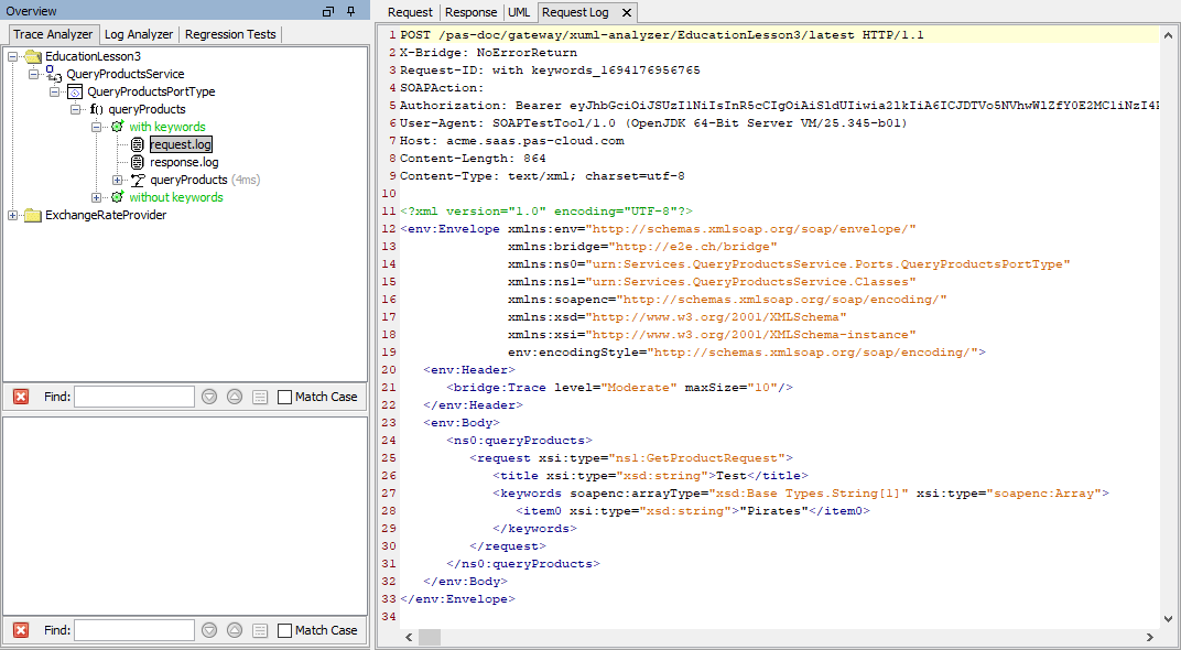 To inspect the request SOAP message that was sent to the service, select the item request.log in the Trace Analyzer tree.