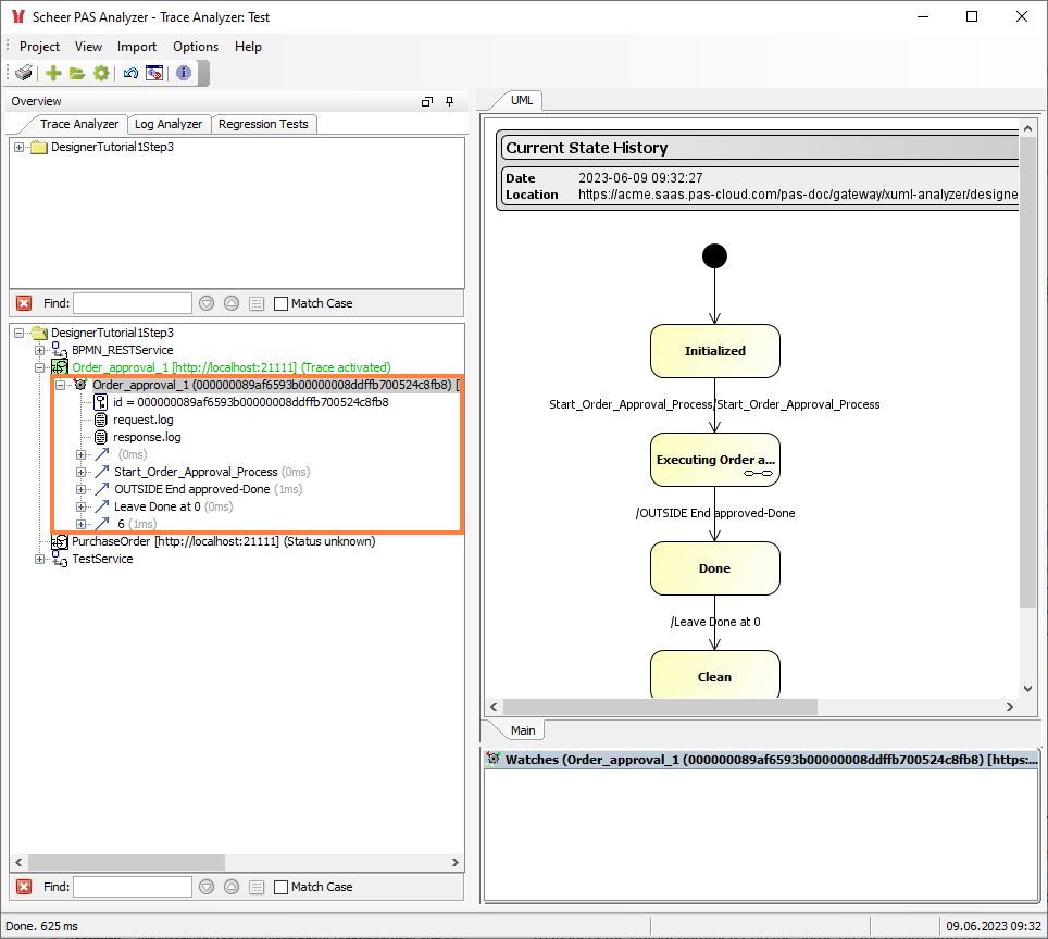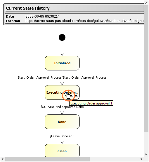 For xUML services running with trace enabled, the xUML Runtime collects tracing information and stores it to the service context. You can download this tracing data and you can browse through a graphical representation of the performed executions.