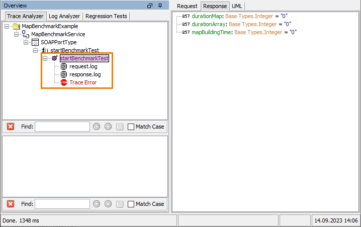 Having run a test case, the Trace Analyzer may show a message like displayed in the figure below. The test case icon becomes purple and an additional red colored stop sign appears in a separate node: