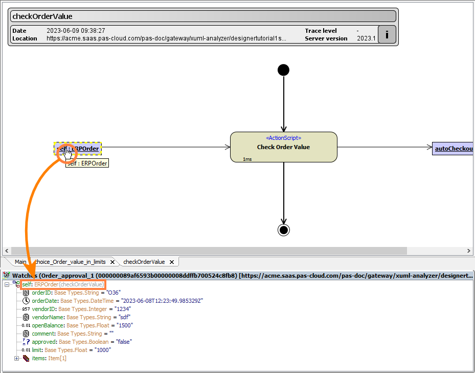 Right-click an attribute of base type and select Show Value from the context menu or double-click the tree item. Now you can have a closer look at its value. The value of the attribute is displayed in detail in a separate window, the xUML Text Viewer.