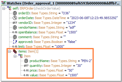 The number of array elements is displayed in parenthesis (items: Item[1]). For each array element, its type is displayed, too.