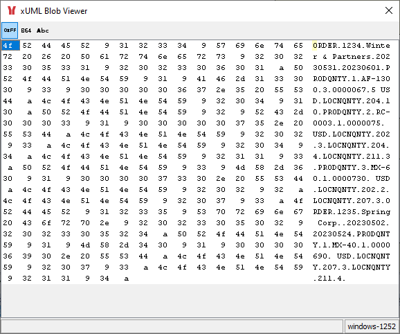 Right-click an attribute of type Blob and select Show Value from the context menu or double-click the tree item. Now you can have a closer look at its value. The value of the attribute is displayed in hexadecimal encoding in a separate window, the xUML Blob Viewer.
