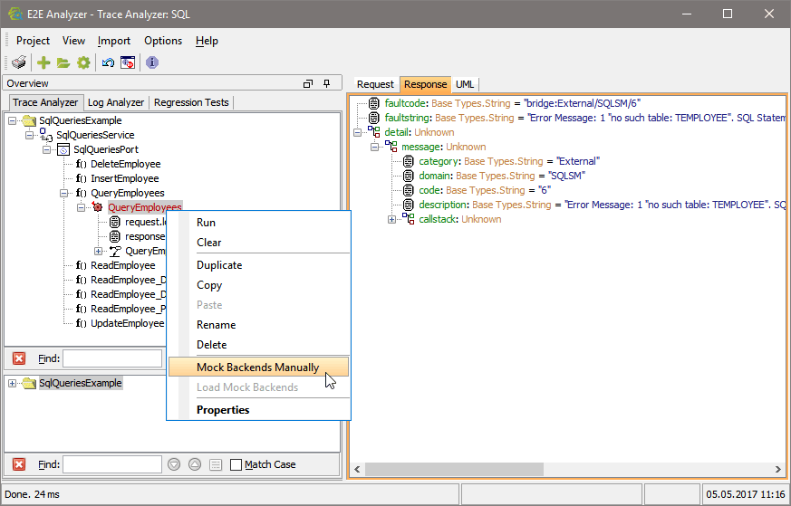 To load mock data from a previous test case run, open the context menu of a test case that has been run successfully once (see QueryEmployees in the screenshot below) and select Load Mock Backends:
