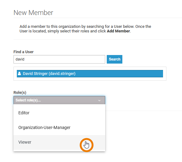 Click the button Add Member to open the New Member page. Use the search field to find the user you want to add to your organization. | |