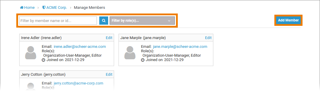 The button opens the Manage Members page of the organization. On this page, the current members of the organization are listed. Use the filters on top of the page to search for a user. If you want to add other users, click on the Add Member button on the right (see 18189633 for details):