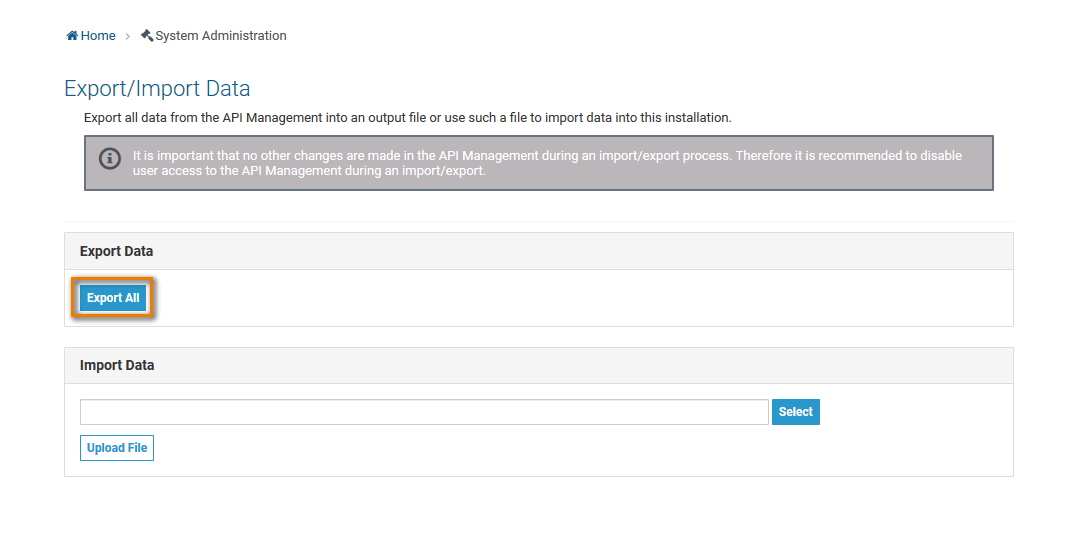 On page Export/Import Data administrators can export all data from the API Management into an output file. The export functionality is not a perfect backup solution, but more of a migration tool. The export contains only configuration data.