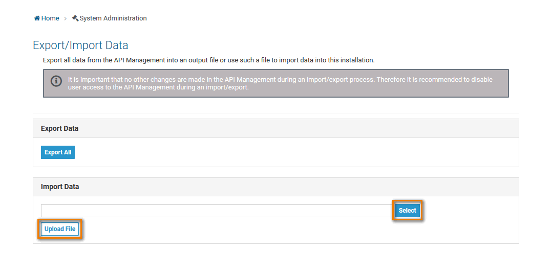 On page Export/Import Data administrators can import 18189935 from file into this installation. Click Select to search your computer for an import file and start the import with the button Upload File: