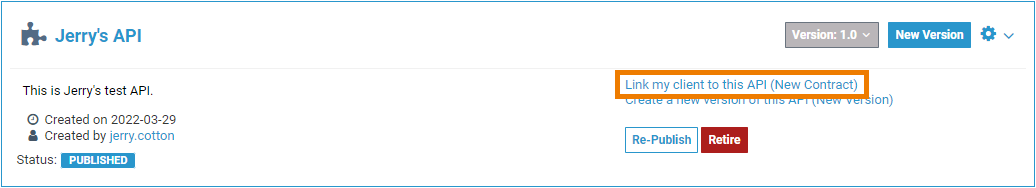 Creating a new contract is also possible from the API details page. In the basic settings of the API you will find the link Link my Client to this API (New Contract):