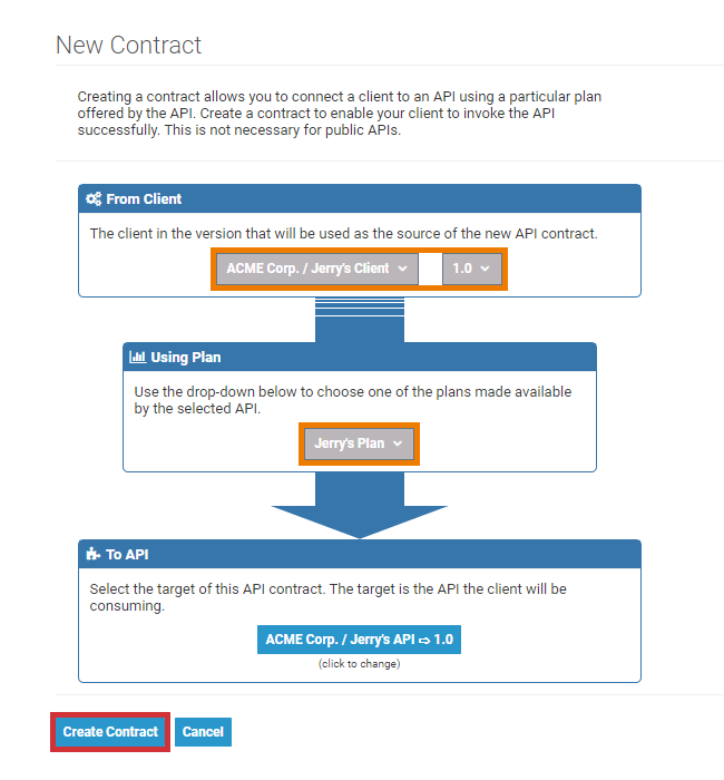 The Create Contract button is only enabled after you have chosen an API. If you click the button, you will be taken to the Contracts tab on the client details page where the new contract is added to the list of concluded contracts for this client.