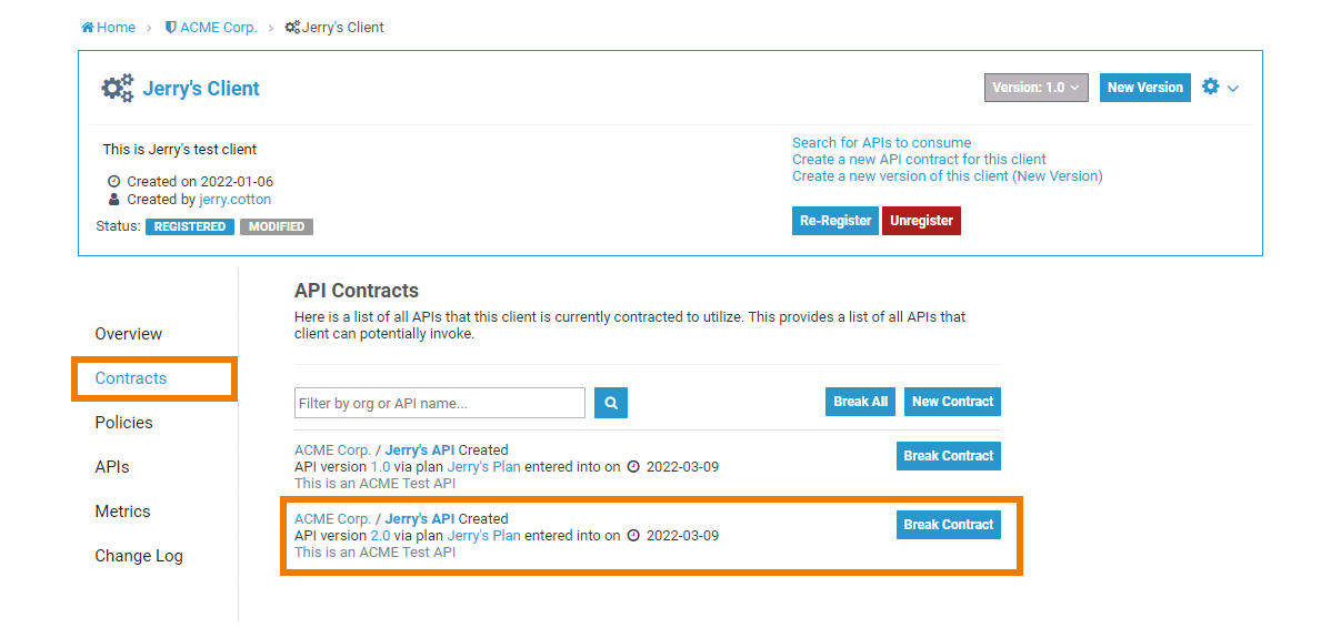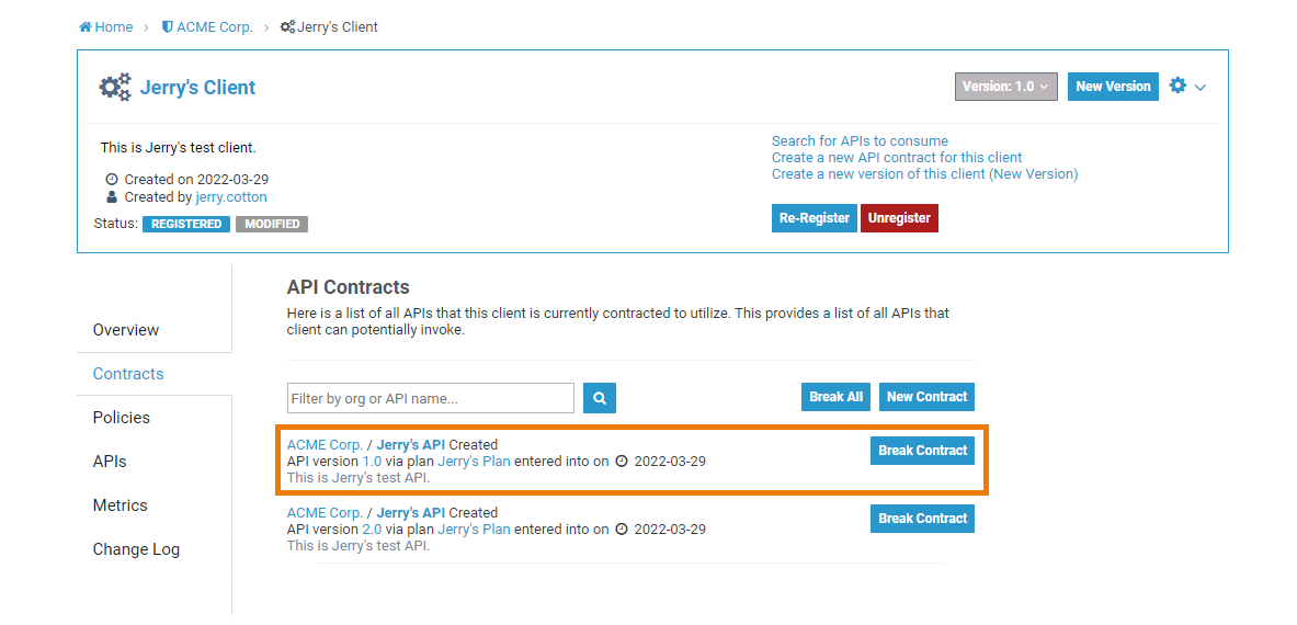 You can also break API contracts from this list by clicking the appropriate Break Contract button.