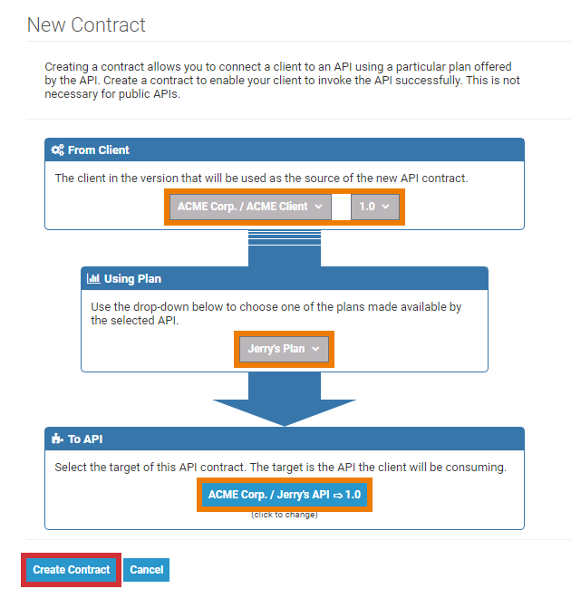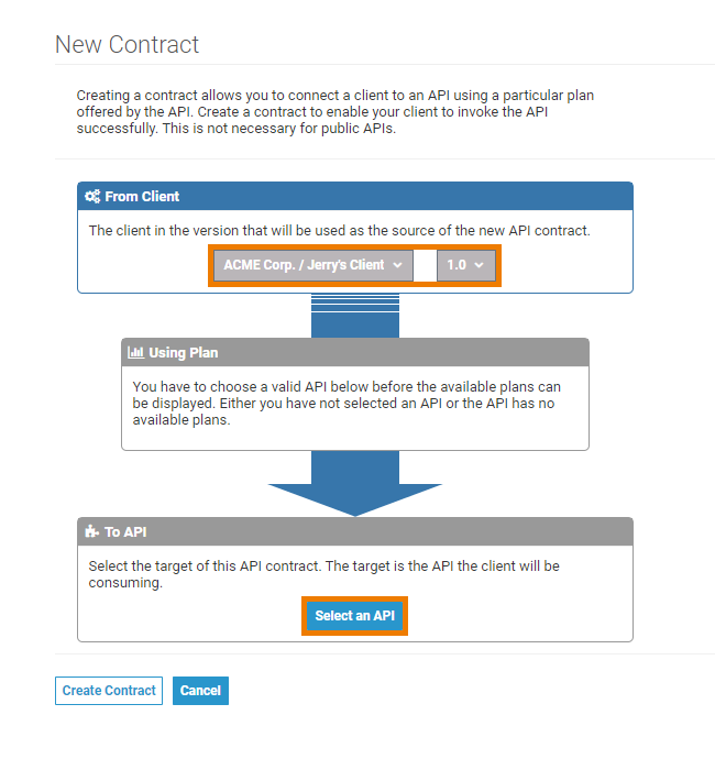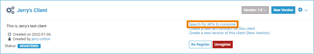 Consuming an API means, that a client is linked to an API, thus is able to invoke this API. The primary action taken when configuring a client is the creation of contracts to APIs. As a contract defines the link between an API and a client, creating a contract is possible in two ways