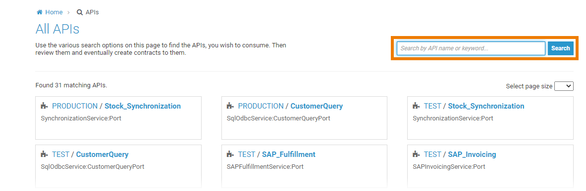 If you use this link, you will be taken to the API search (see page Finding APIs for details). Use the search to find the API you wish to consume: