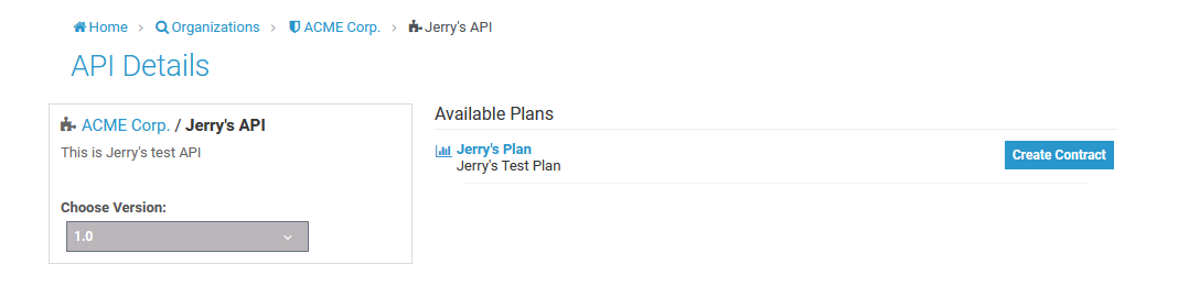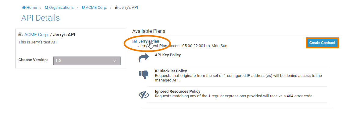 This page presents you a list of all the API versions and a list of all of the available plans the API can be consumed through. You can click on an individual plan to see the details of the policies that will be enforced should that plan be chosen. Click on the Create Contract button next to the plan you wish to use when consuming this API: