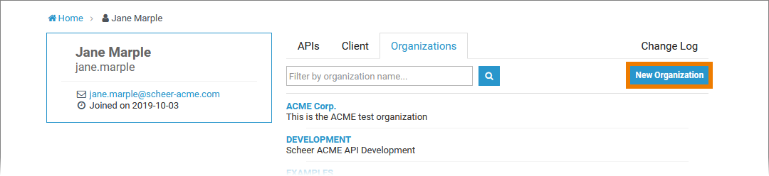 2. Choose My Organizations to display an overview for your existing organizations - and use button New Organization to create a new one.