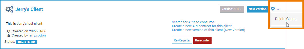 Deleting a client will erase the client including all its information from the API Management. If you want to delete a client, click on the gear wheel in the basic settings to open the configuration options and choose Delete Client: