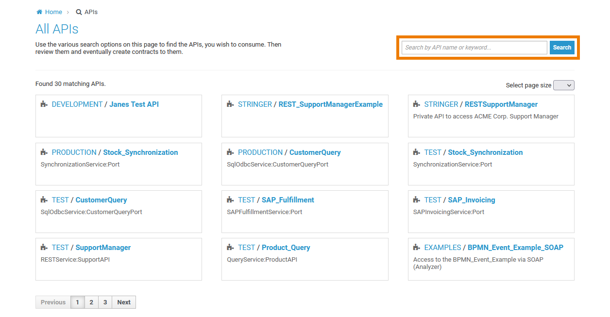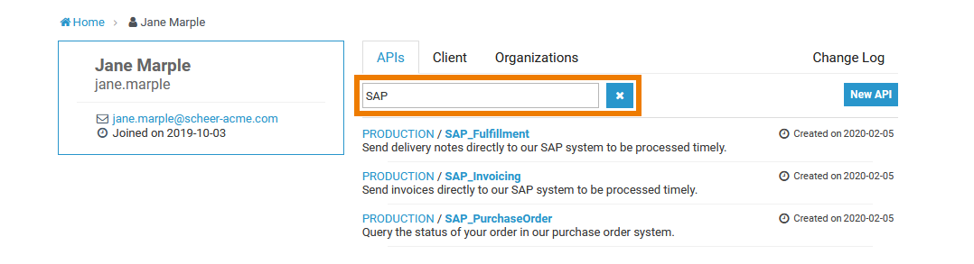 You can also search for any API. Select All APIs to display a list of all APIs that you are allowed to see (according to the visibility concept, see page API Settings for details). You can filter the list by using the search on the top right: