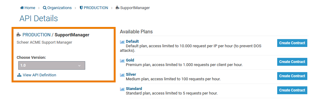 If you want to revise the settings of an API, you will have to open its details page (see API Settings for further information). The details page opens, if you click on the name of an API belonging to one of your organizations.