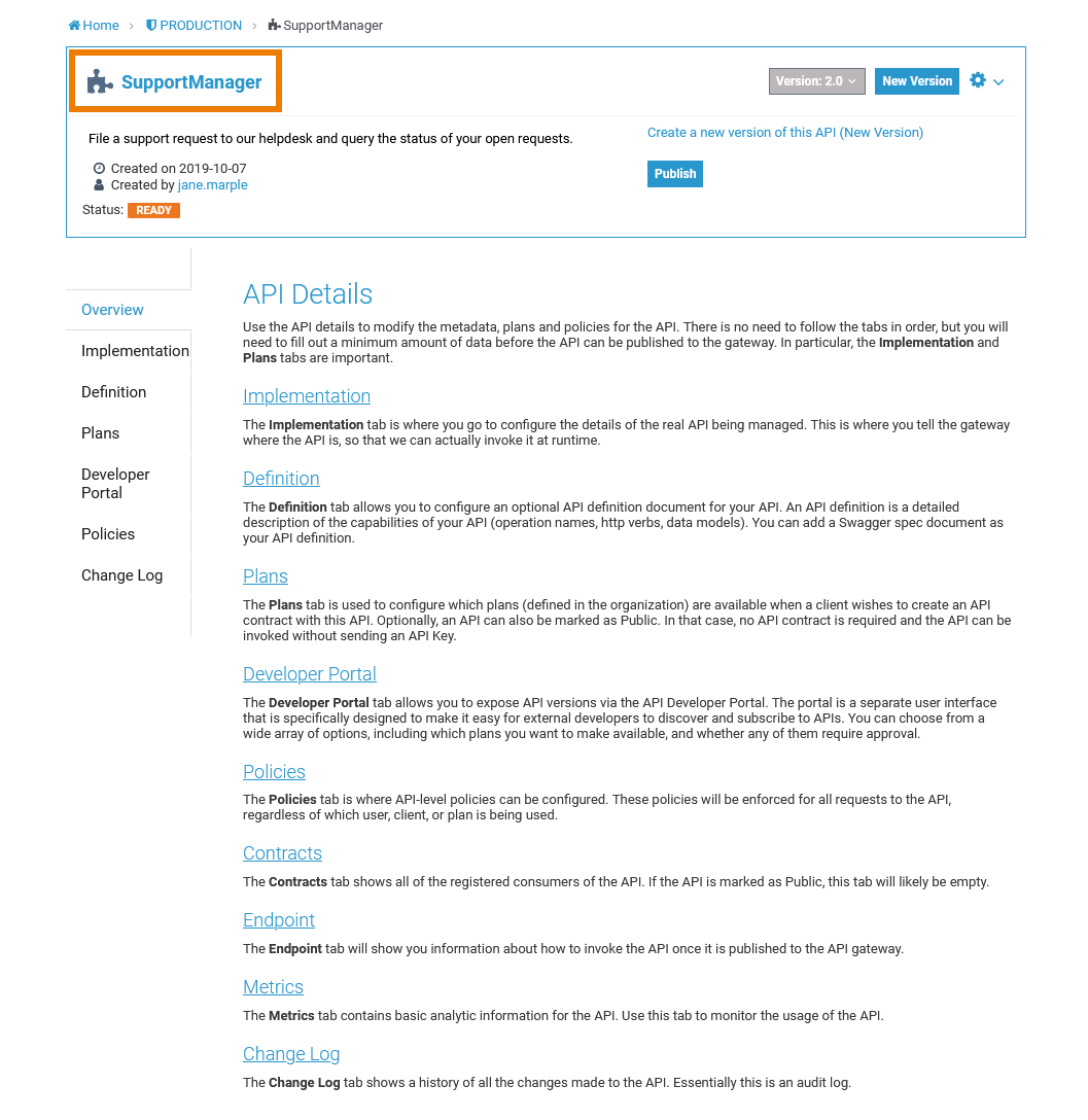 If you click on one of the API tiles, the consumer-oriented API details page will open: