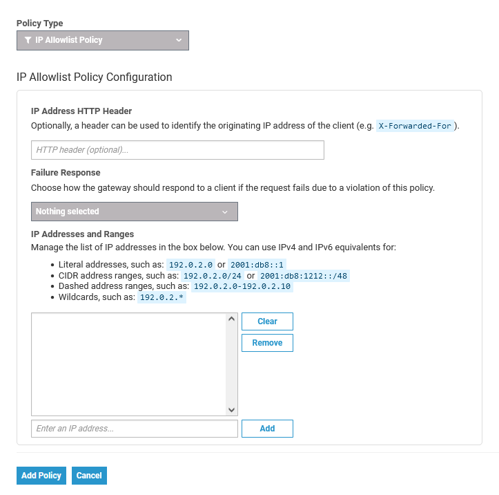 In the IP Allowlist Policy only inbound API requests from clients, policies or APIs satisfying the policy are accepted. To use this policy, you have to specify the IP address ranges to be included to be able to access the API. Addresses that you do not explicitly include are not able to access the API.