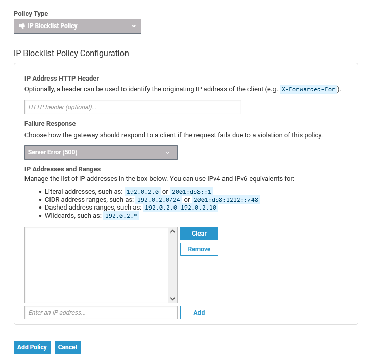 The IP Blocklist Policy blocks access to the resource of an API based on the IP address of the client. Users are able to use wildcard characters in specifying the IP addresses to be blocked. In addition, you have the option of specifying the return error code sent in the response to the client if a request is denied.