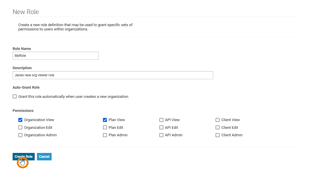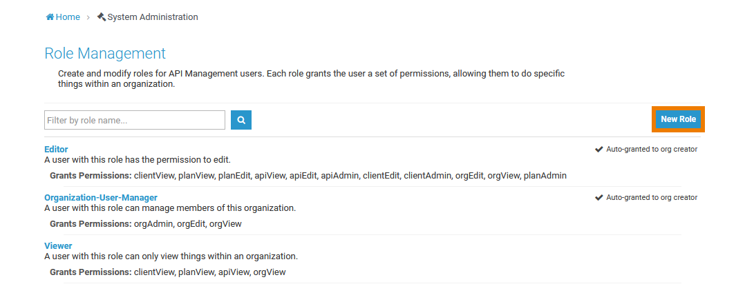 Editor | Grants the user the permission to edit. | API Admin, API Edit , API View, Client Admin, Client Edit , Client View, Organization Edit, Organization View, Plan Admin , Plan Edit, Plan View |