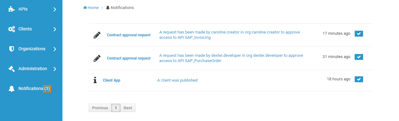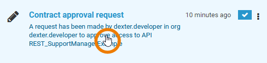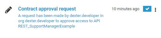 | Task messages inform the administrator about open requests or pending tasks. Example: A developer requested access to a Private API. |