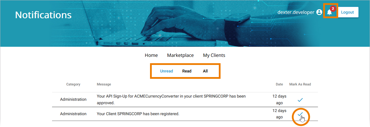In the API Developer Portal, you can select between different notification views (Unread, Read, All). Use icon