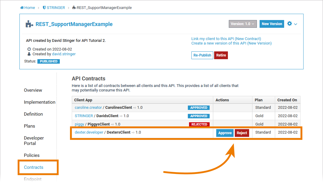 | ... to open the Contracts tab on the details page of the relevant API where you find the Approve/Reject buttons to authorize the request - or to deny it. Use the breadcrumb menu at the top of the page for guidance. |
