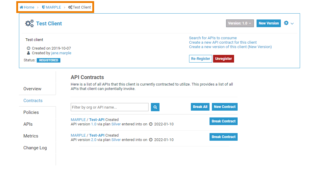 ... to open the Contracts tab on the details page of the relevant API where you find the Approve/Reject buttons to authorize the request - or to deny it. Use the breadcrumb menu at the top of the page for guidance. |