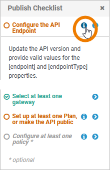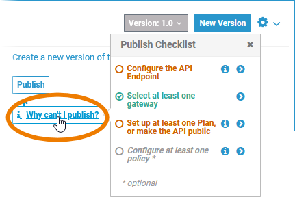 | If the API cannot yet be published, the notification Why can't I publish? will appear near the Publish button. Click this notification to open the Publish Checklist. The checklist provides details about what information is still required before the API can be published.  |