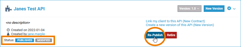 When you have finished the configuration for an API, you have to publish it to the runtime gateway. This can be done from any tab on the API details page by clicking the Publish button in the 18189369. If successful, the status of the API will change from