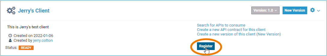 Even if a client has already been registered, you can continue to make changes to it, for example to modify its policies or to create or break API contracts. If you modify a client, the Re-Register button will become enabled: