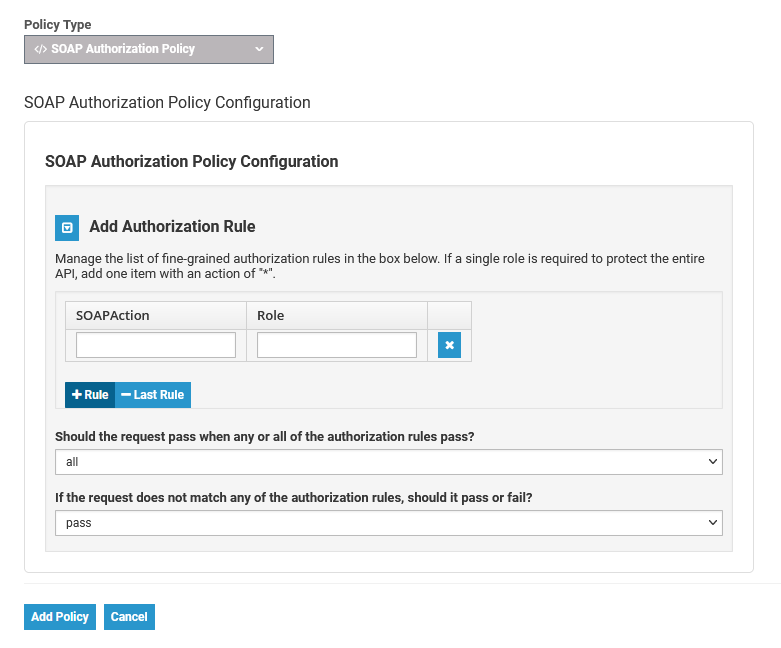 The SOAP Authorization Policy is nearly identical to the Authorization Policy, with the exception that it accepts a SOAPAction in the HTTP header.