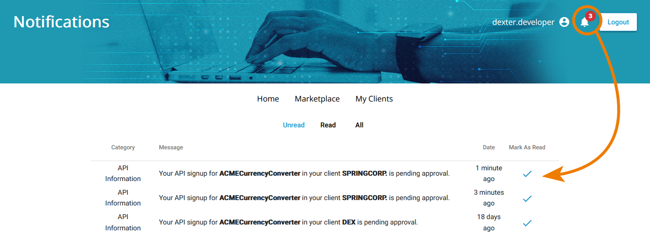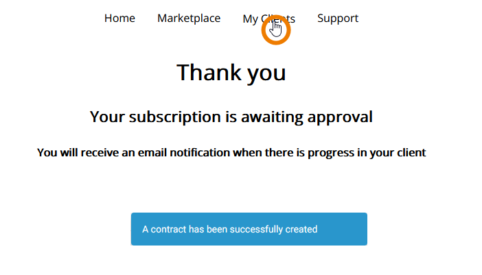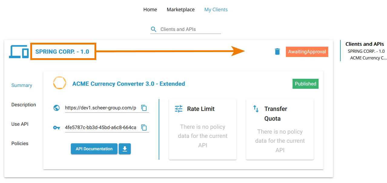 | A success message is displayed in the Developer Portal. If approval is required for the API you subscribed to, you now have to wait for the approval. If you want to check your newly created client, switch to the My Clients tab. Go to Using "My Clients" for detailed information. |