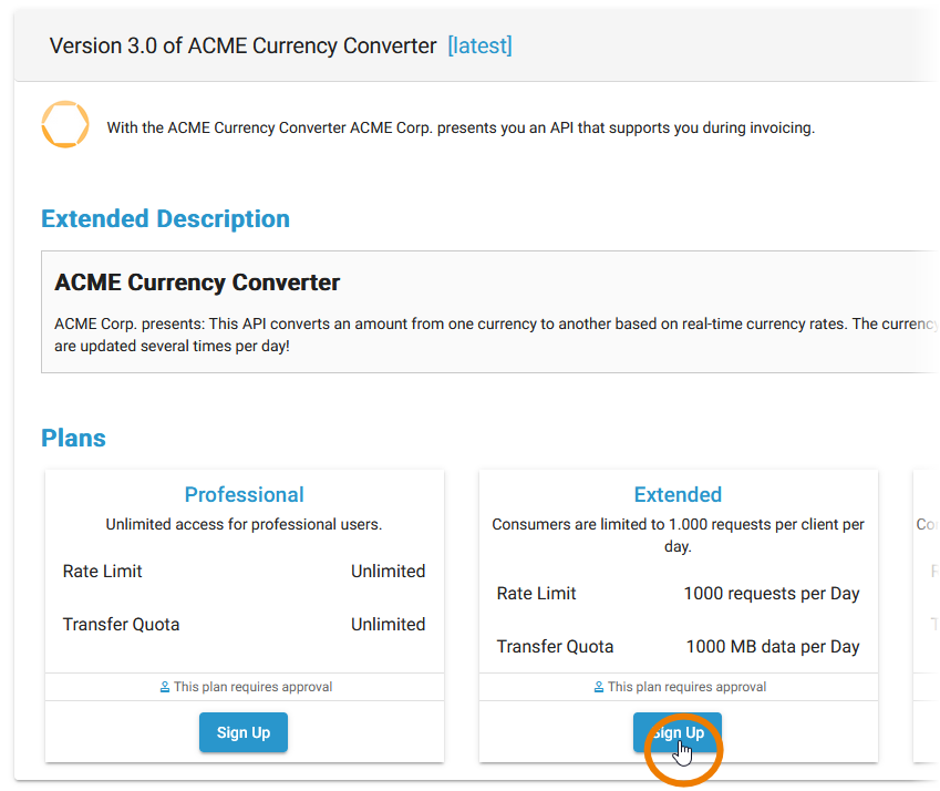 | Users must have a valid account to consume the APIs. When a user presses the Sign Up button of a plan, the system checks if the user is already logged in. |