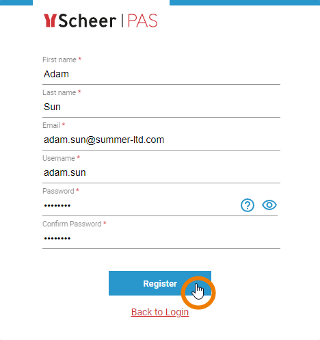 | Clicking on the link will open a new window where the user can enter his account details. To send his request, the user must confirm his entries with the Register button. |