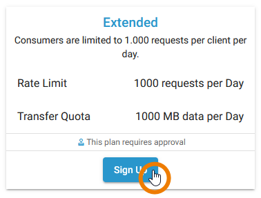 | In section Plans you will find all available plans for the API and the information if approval is required for a plan. Click the Sign Up button on the plan you want to register for. Users must have a valid account to consume the APIs. The API Developer Portal offers a user self registration feature that allows customers to request for an account. Ask your Scheer PAS administrator if you want to enable the user self registration. Refer to 18189988 for a detailed description how your customers can use the user self registration. |