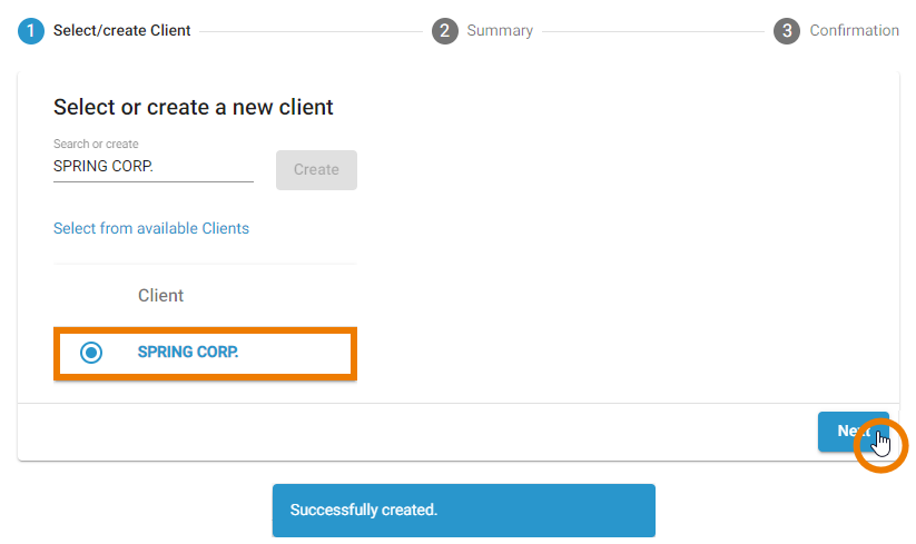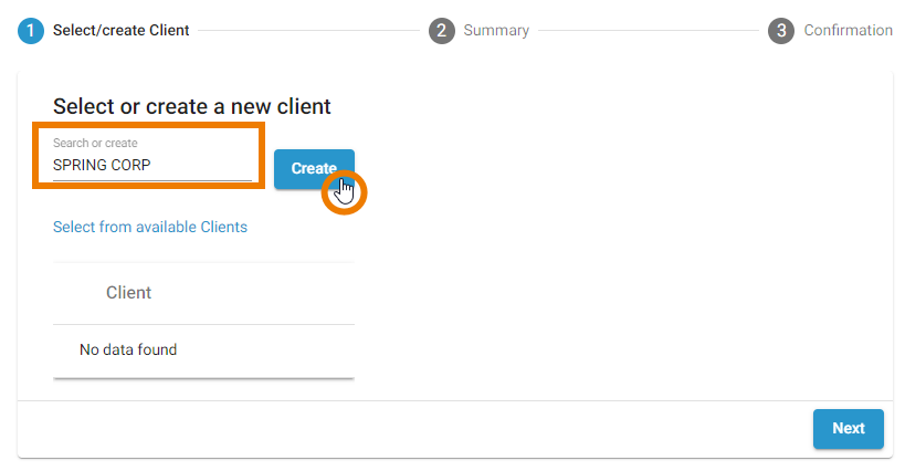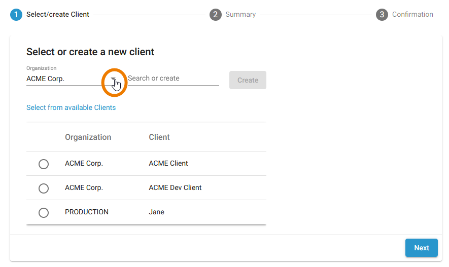 | If your user has permission to use or create clients in various organizations, a different view will be displayed: A drop-down list Organization will appear.