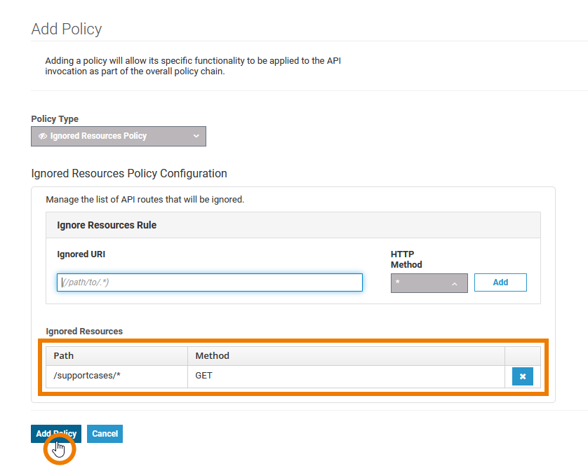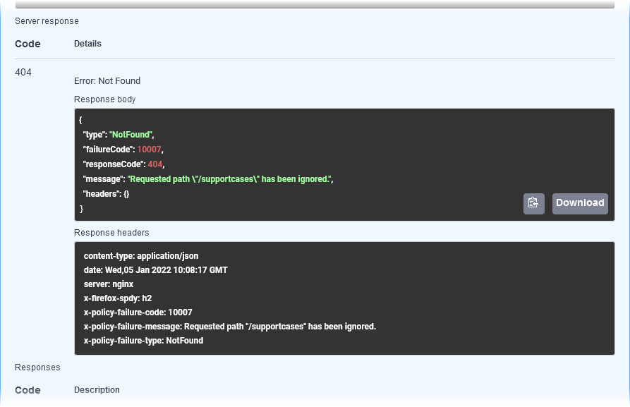 You can also test policy application using the Swagger UI. Assume that for  the current API (SupportManager in this case) the Ignored Resources Policy has been added. Consumers of the API should not be able to execute GET /supportcases /*: