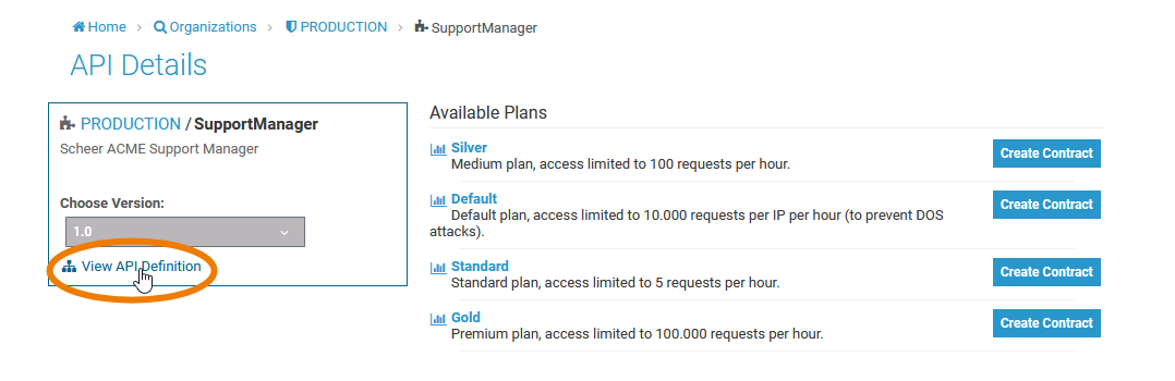 The details page of the API opens. If the API has a definition file linked, a link View API Definition is displayed: