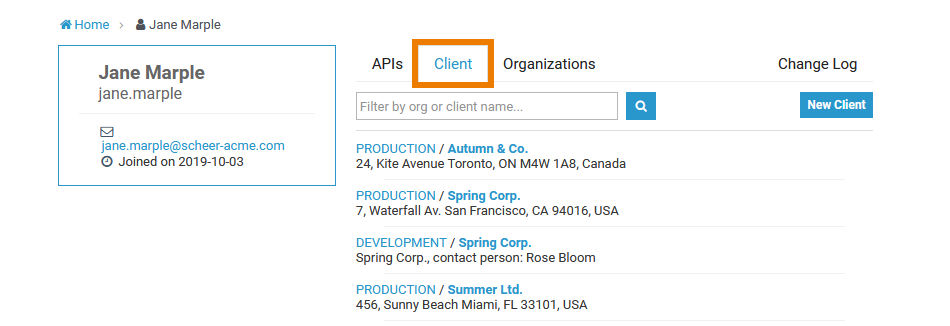 Clients | My Clients | Choose 18189306 to display a list of all clients belonging to organizations you are member of. |