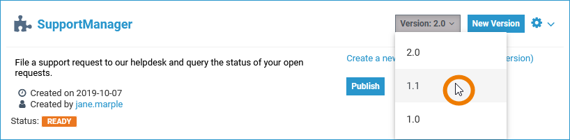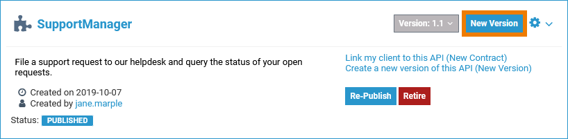 Versioning allows you to modify the configuration of an existing element, but retain the previous version. To create a new version of an element, open its details page and click New Version in the basic settings: