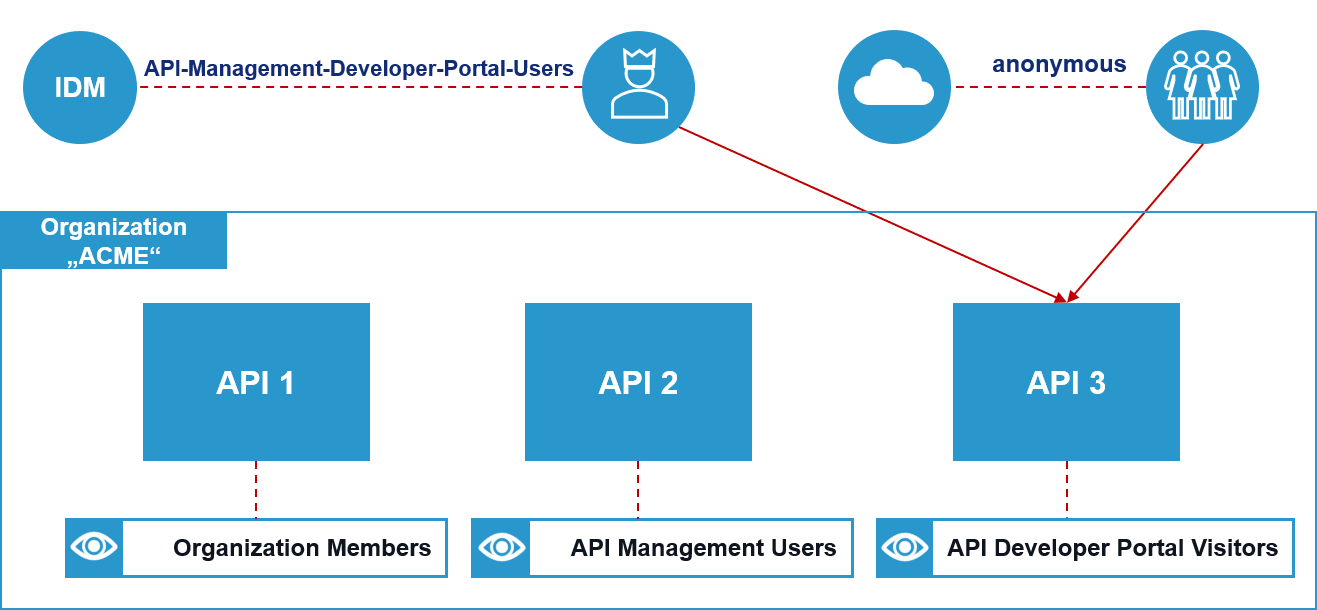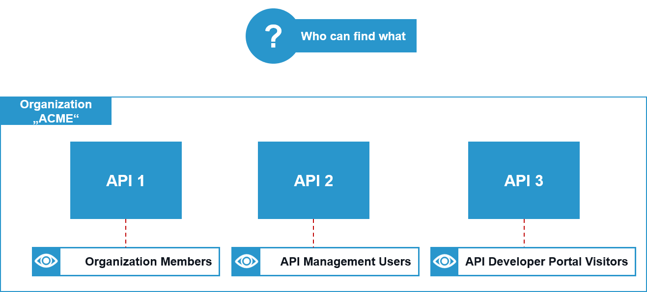 ![]()  | Organization Members (default) APIs are secured by default: If you create a new API, the default visibility setting is Organization Members. Only members of the organization the API has been created in are allowed to see it. Example: API Management users who are explicit member of organization ACME can see API 1, API 2 and API 3.  |