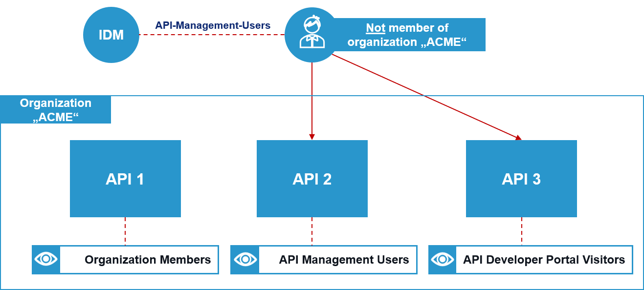 ![]() | API Management Users Select the visibility API Management Users to allow all API Management users to see your API. Example: All API Management users or administrators can see API 2 and API 3, they do not need to be member of organization ACME. |
