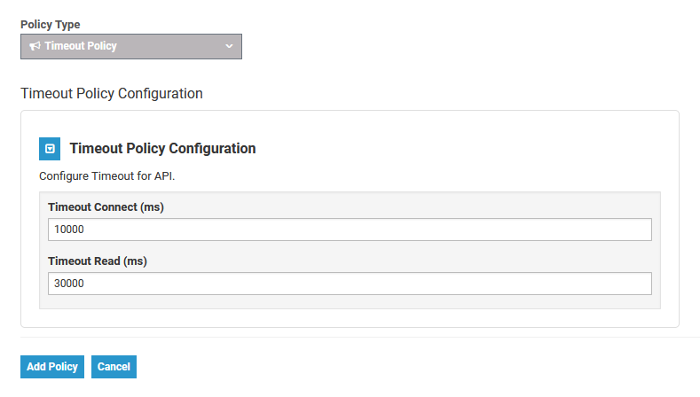 The Timeout Policy allows you to determine timeouts for your API. You can differentiate between a timeout for the initial connection and a timeout for the entire request. The timeout set in this policy overrides the global timeout for this specific API.